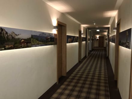 Flur zu den Zimmern mit unzähligen Fotografien von Willy Bogner an den Wänden.
