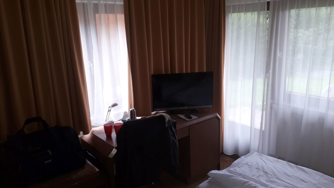 ZimmerTV mit üblichen Programmen. Raum nahezu komplett verdunkelbar. Kleine Terrasse mit zwei Stühlen und einem Tisch. Mehfachsteckdosenleisten.