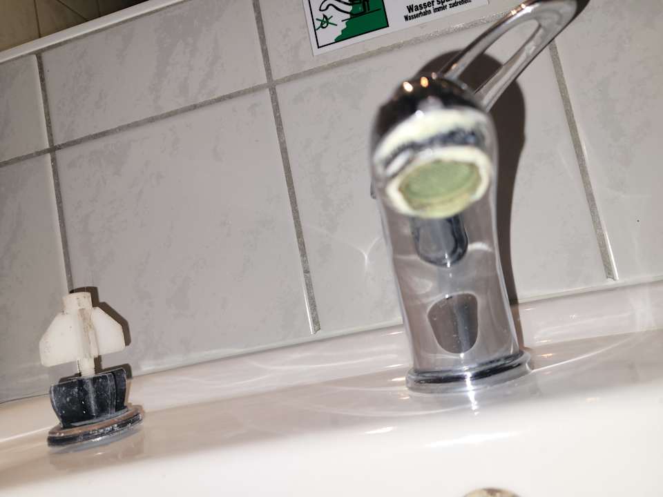 ZimmerDer Wasserhahn im Bad verkalkt und dreckig.Daneben der dreckige Stöpsel, das hat schon lange keiner mehr sauber gemacht.