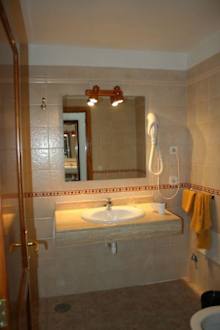 Das Badezimmermit kombinierter Duschwanne (hier nicht zu sehen, aber gleich links). Genügend Abstellfläche und groß genug für zwei