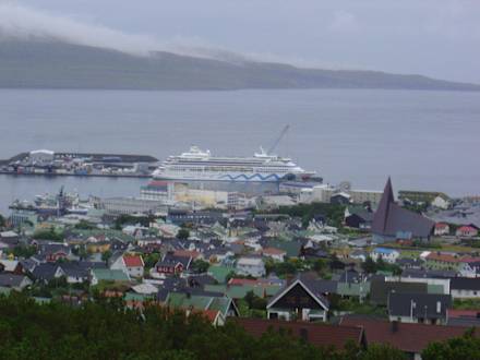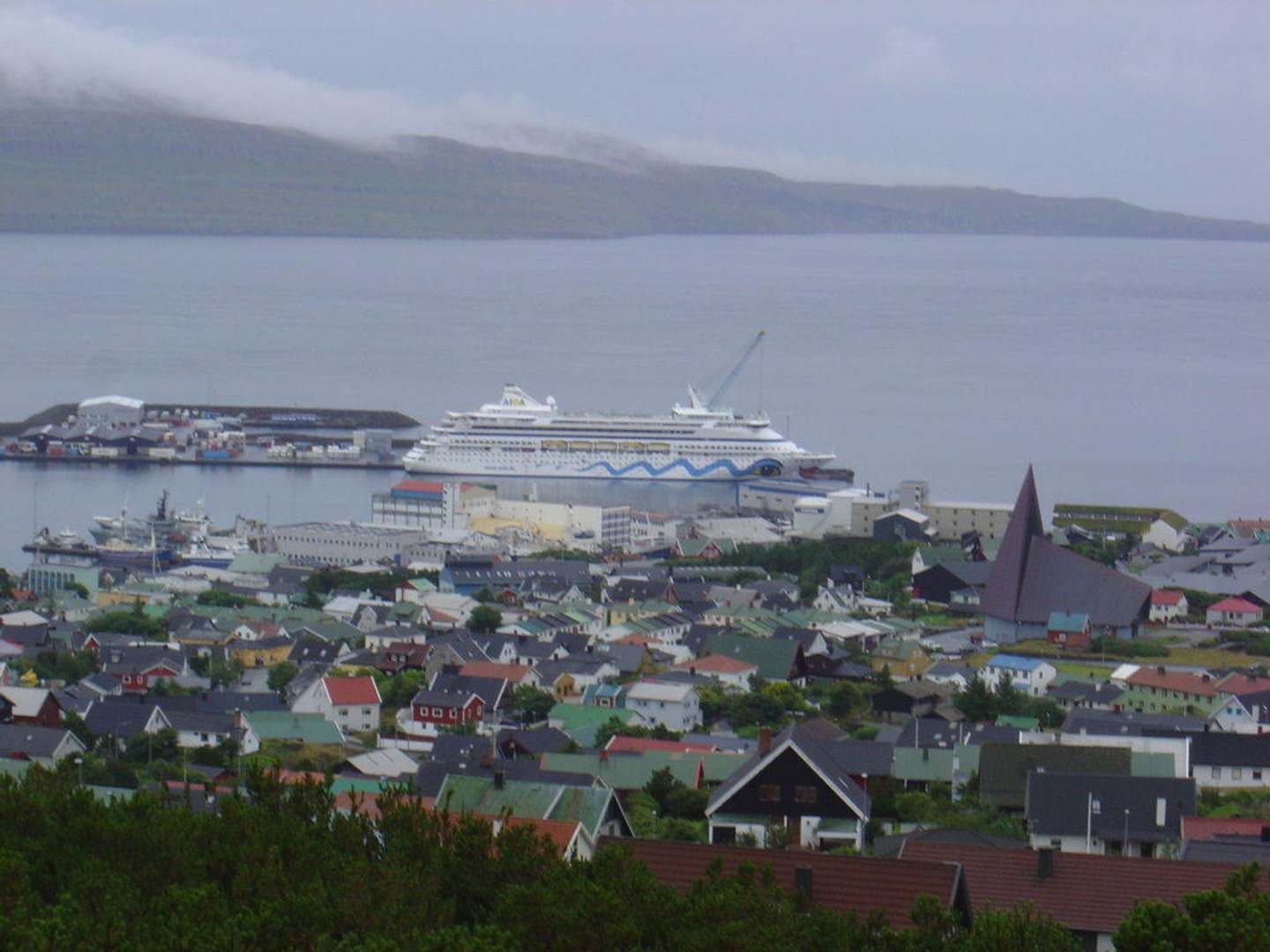 Blick auf den Hafen und AidaBlick vom Zimmerfenster auf die Stadt, den Hafen und das Kreuzfahrtsschiff Aida Aura