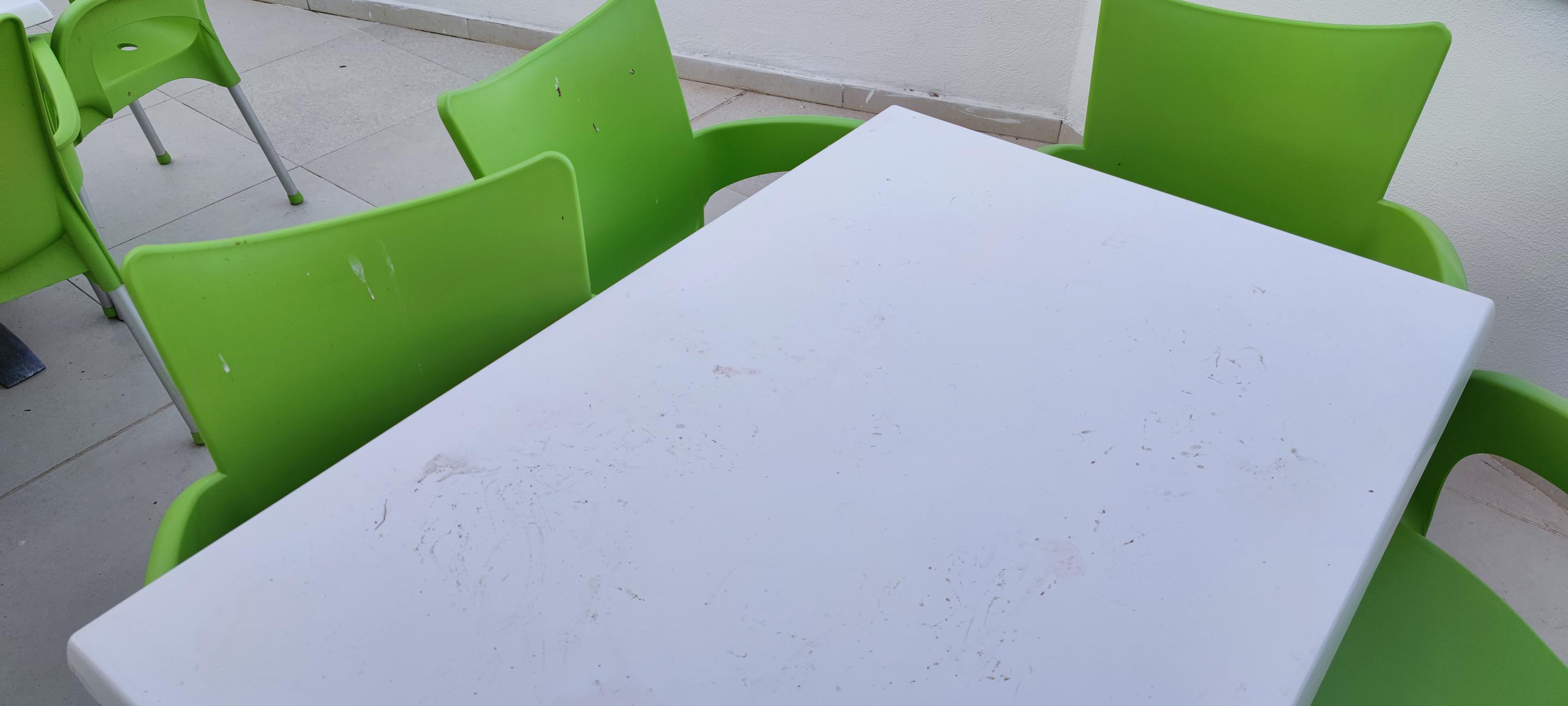 Tische und Stühle am Pool verdreckt
