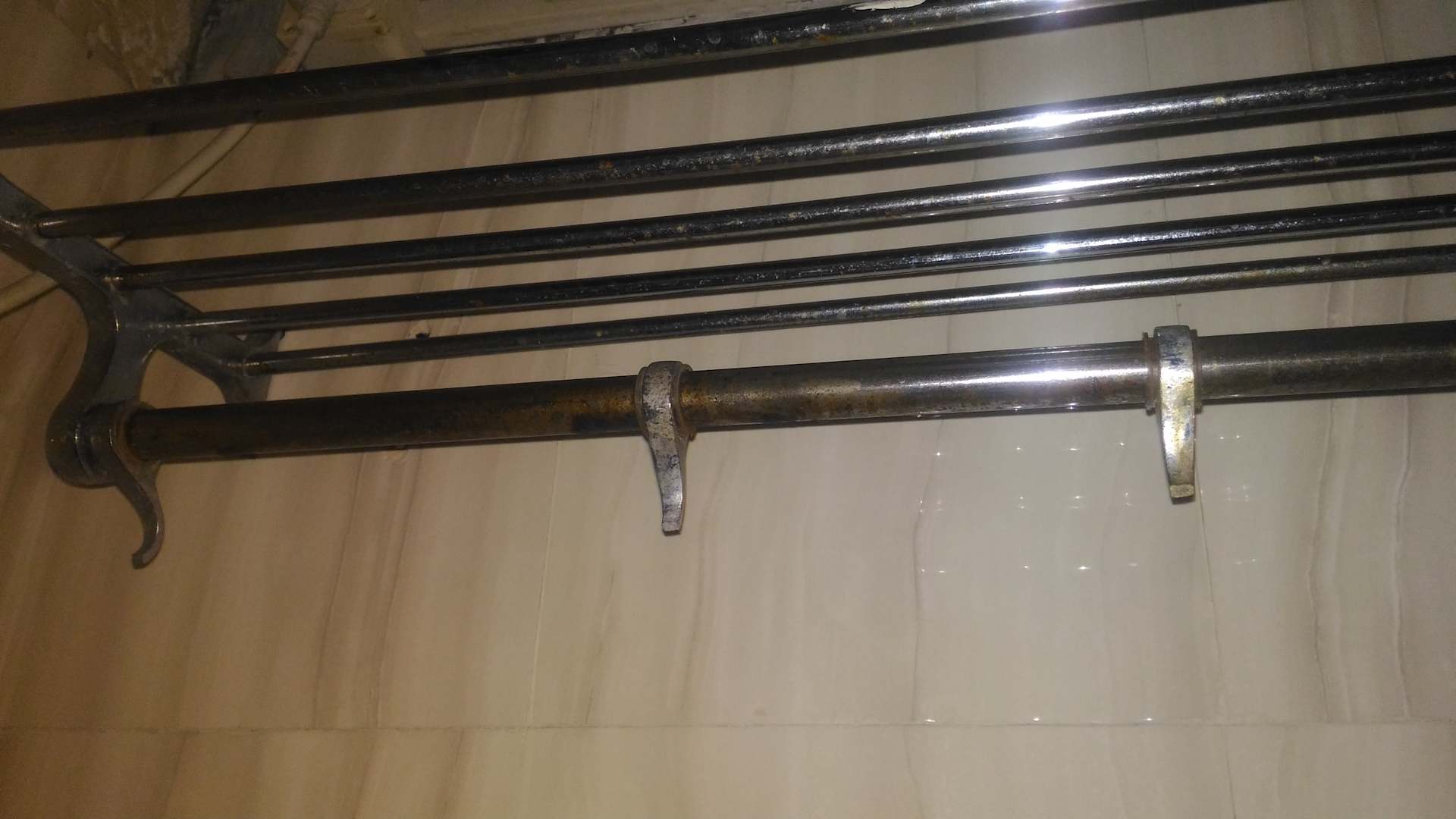 ZimmerDie tolle "Badezimmer" Ausrüstung: Eine verrostete Ablage mit abgeschlagenen Haken - mit dem nassen Badetuch?
