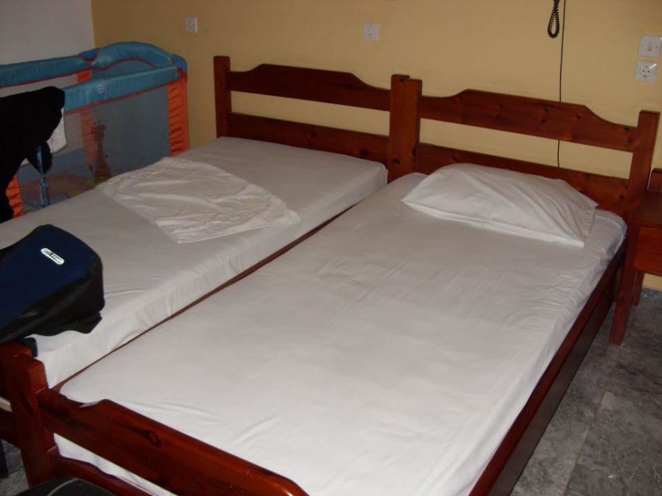 Betten im Hotel FrangiskosMöblierung war zwar alt und einfach, die Betten aber bequem. Bettwäsche wurde 2x die Woche gewechselt.