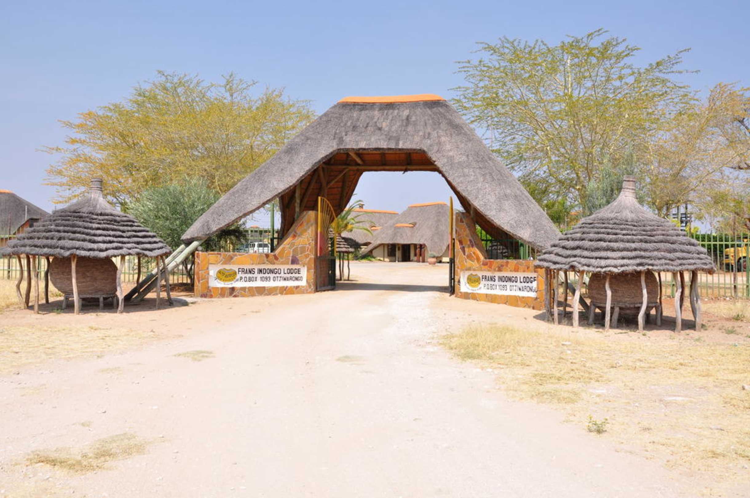 Einfahrtstor zur LodgeHinter diesem Tor und dem Zaun befindet sich eine grosszügige Lodge mit Bungalows, Restaurant, Bar, Pool und Aussichtsterrasse