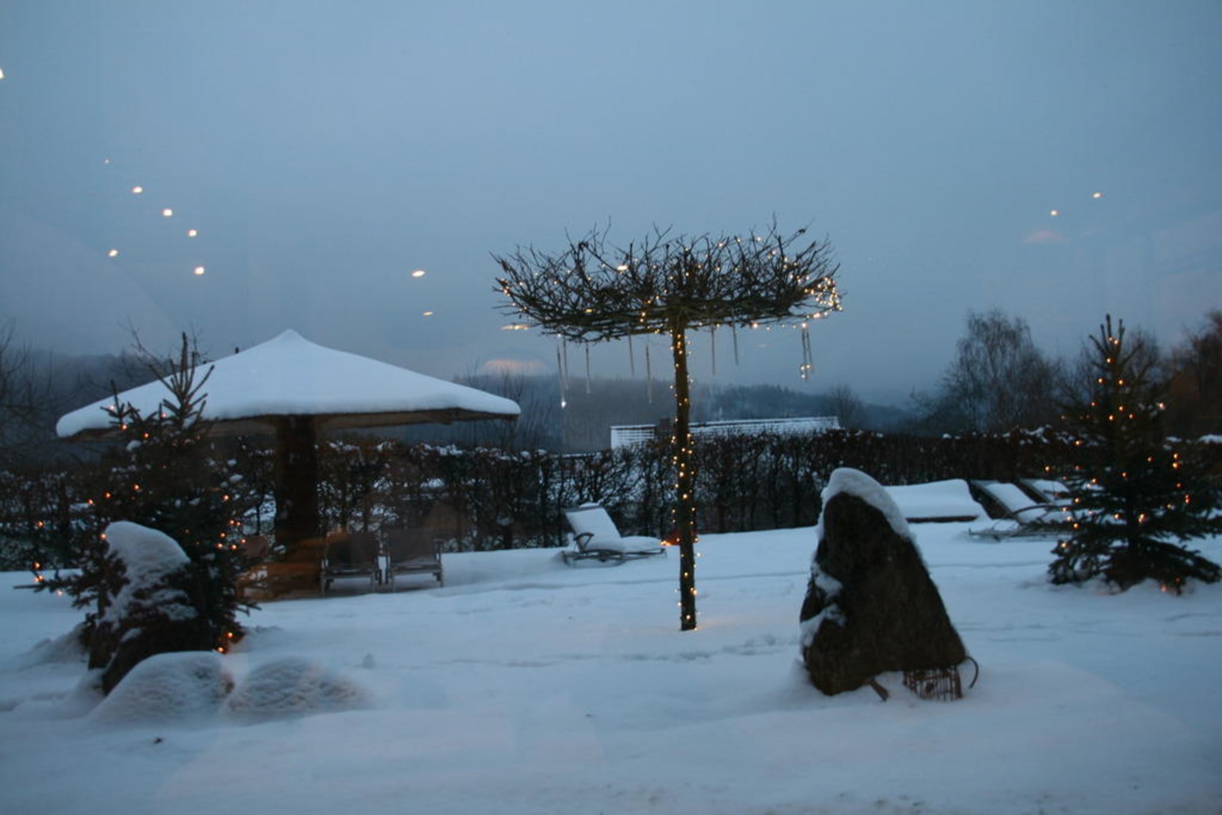 Ausblick auf die Außenanlage des Wellnessbereichs