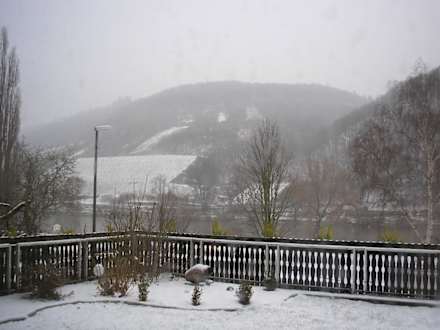 Blick aus dem Wintergarten auf die Terasse und die Weinberge im Hintergrund.