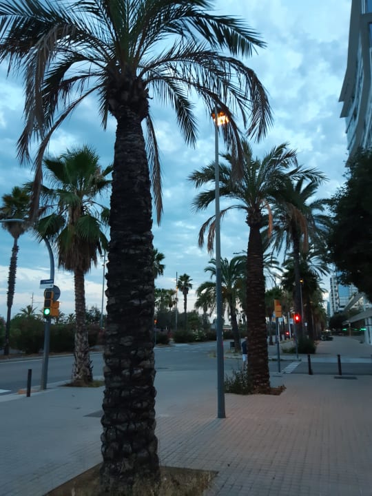 Großer Fußgängerbereich mit vielen Palmen vor dem Hotel
