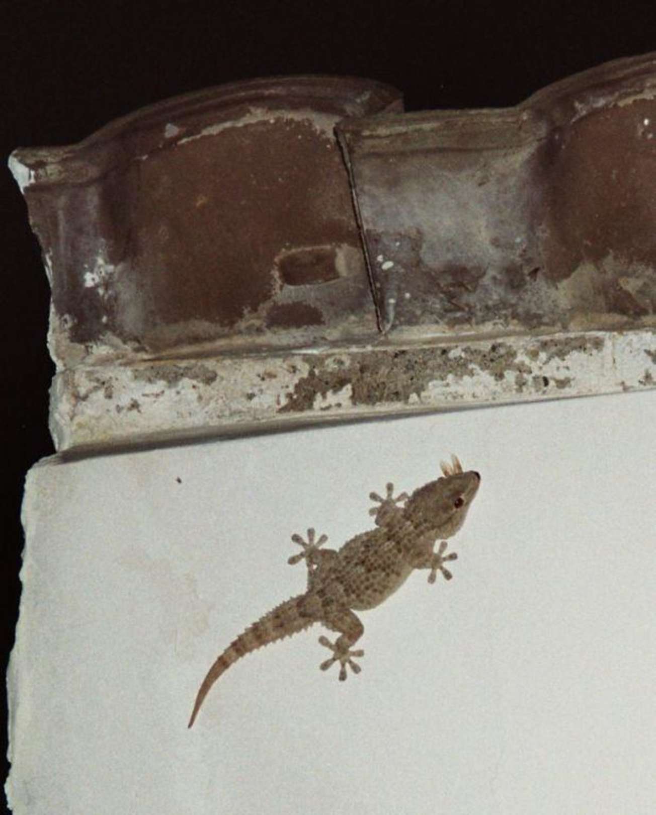 Nächtlicher Spuk: Gecko auf Unterseite der Balkondecke.