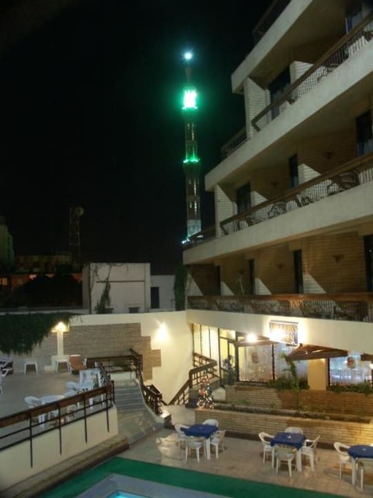 Blick vom ZimmerbalkonDas Bild zeigt einen Blick vom Zimmerbalkon auf den Innenbereich des Hotels mit dem Pool und im Hintergrund den nahe stehenden Minarett-Turm, der sich durch seine unglaubliche Lautstärke der Lautsprecher doch recht lästig auswirkte.