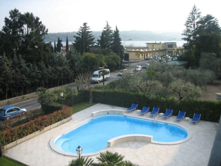 Blick vom Hotelzimmer auf Pool und Hauptstrasse