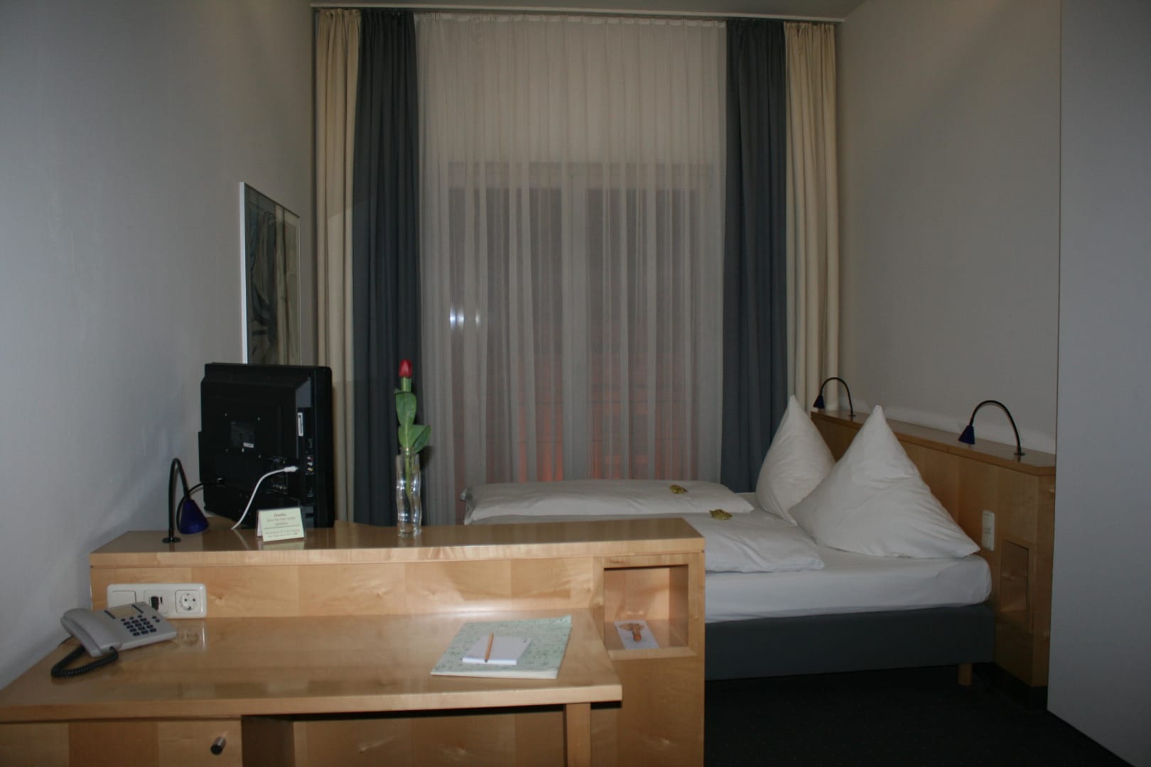 Schreibtisch, im Hintergrund das sehr bequeme Doppelbett
