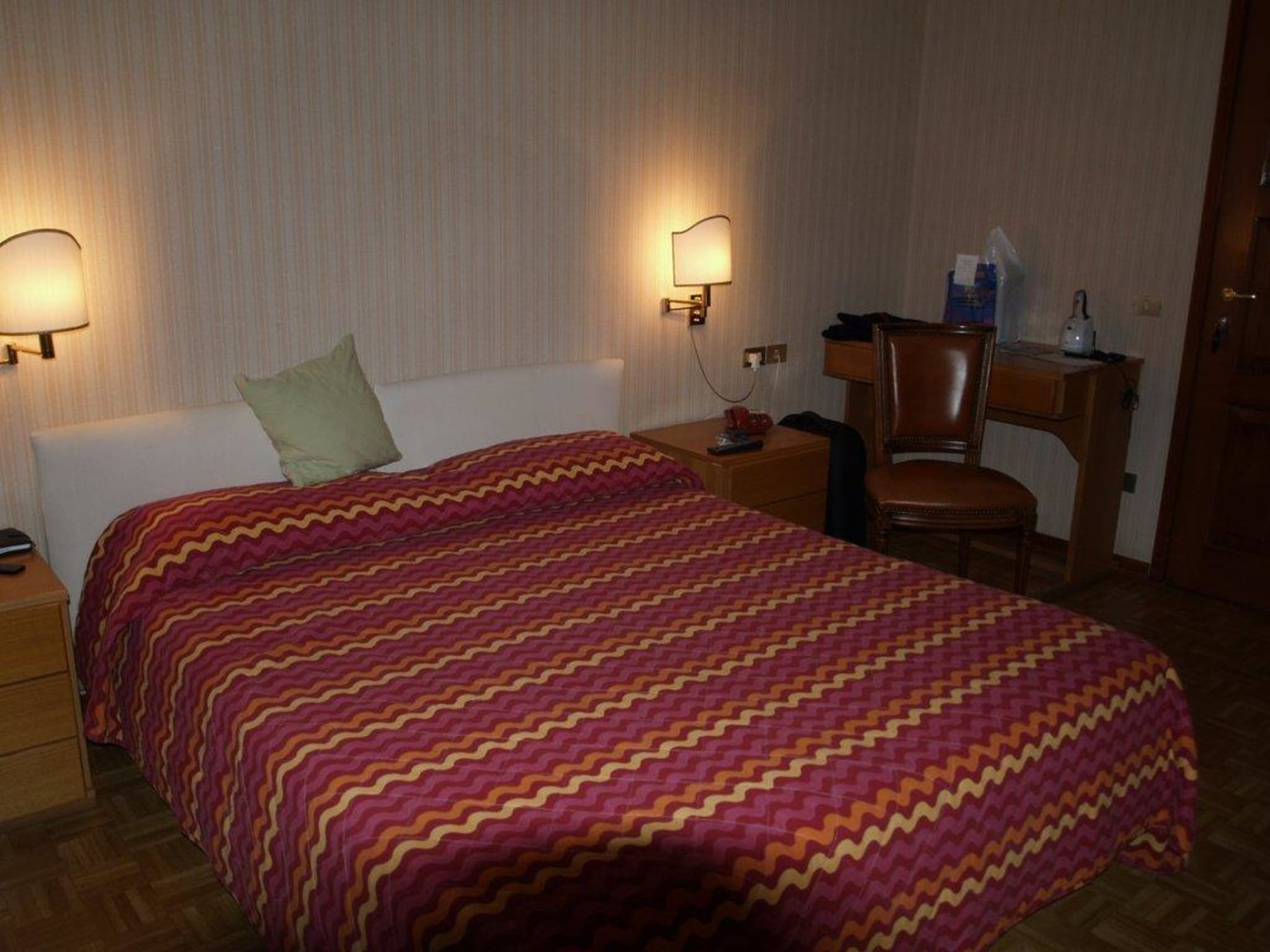 Blick auf das Bett und den Schreibtisch, rechts die Zimmertür.
