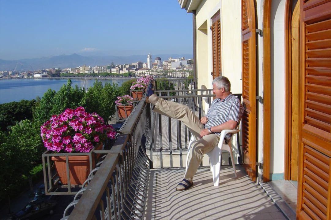 Blick vom schönen Hotelbalkon auf das Meer und die Stadt Milazzo