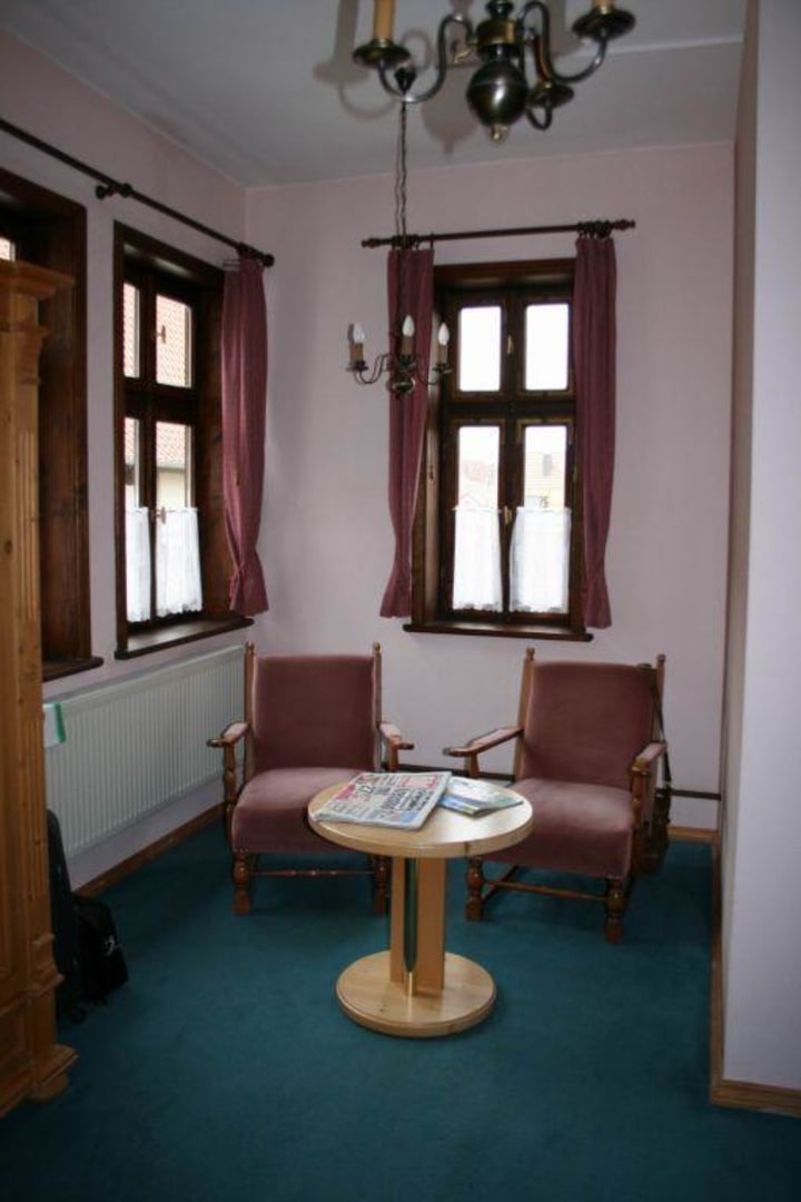 Sitzecke im HimmelbettzimmerVon hier aus kann man sowohl den Blick über die Dächer der Stadt als auch eine schöne Fersehsendung geniessen.