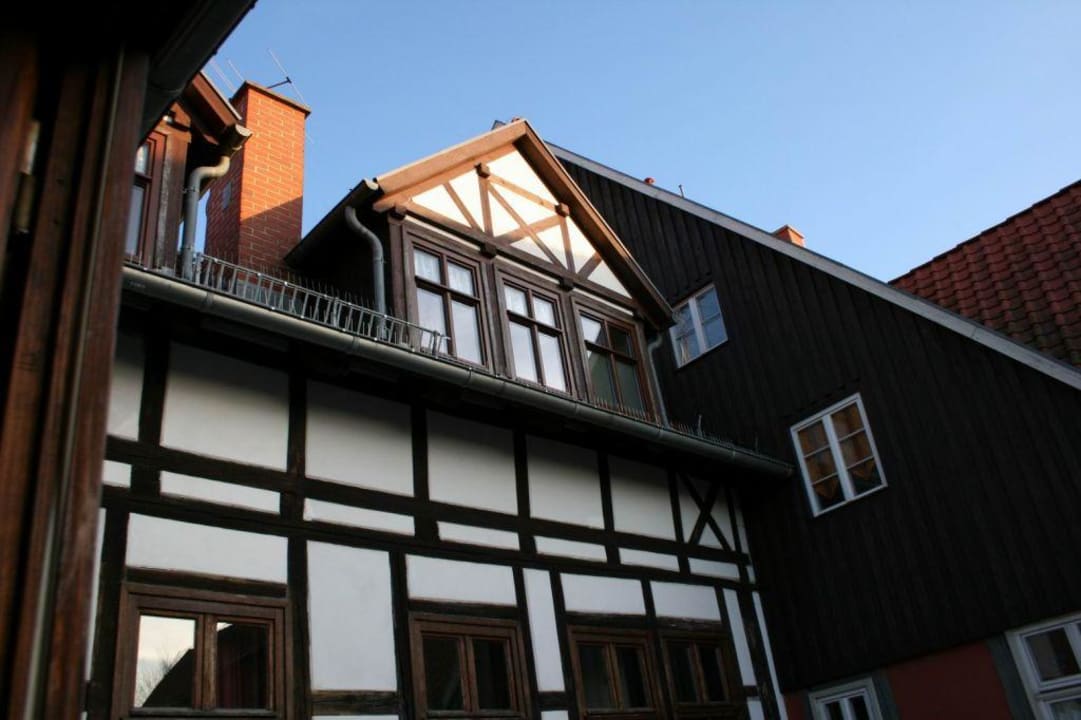 Blick zum Dachgeschoß des Hotels auf der Hofseite