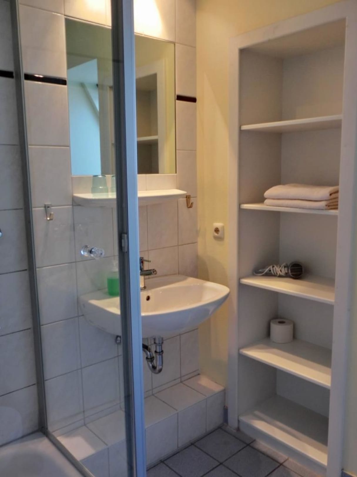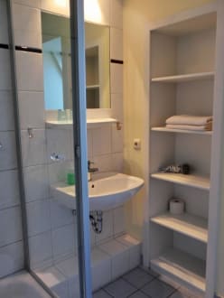 Innenansicht des Bades mit Waschtisch und Regal, sieht alles aus wie neu.