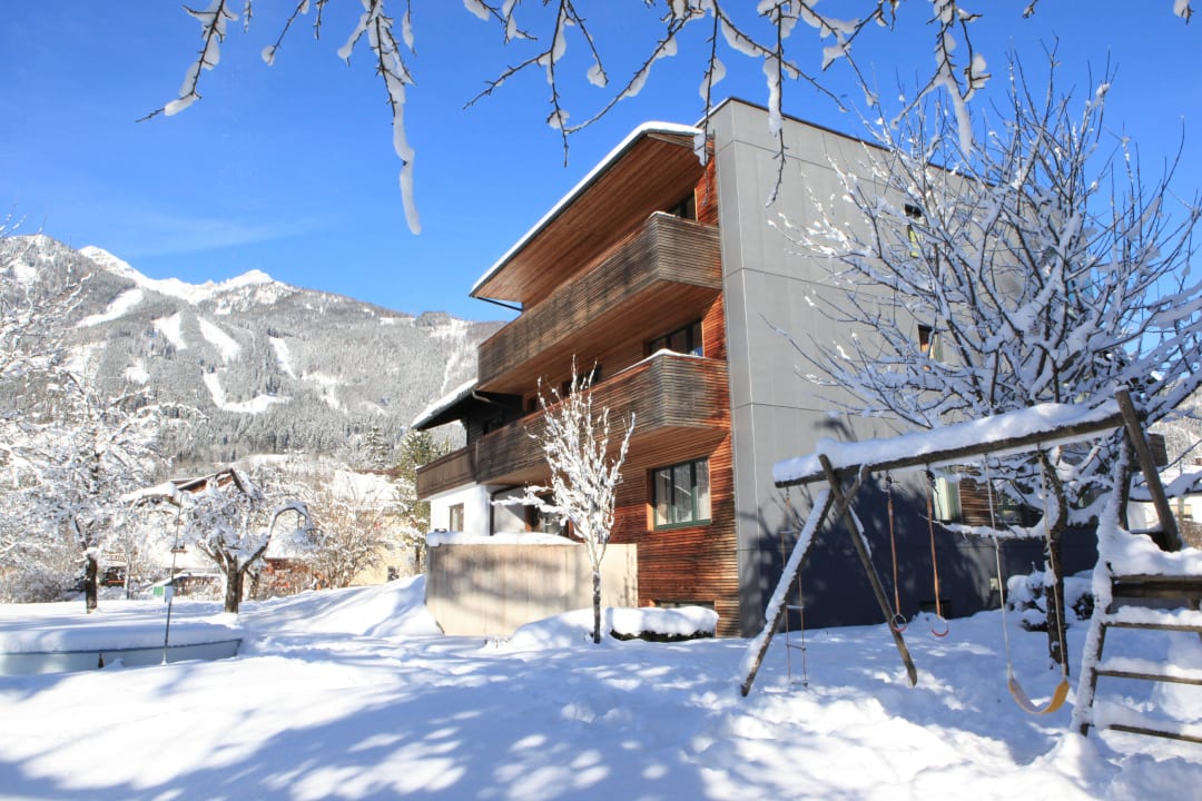 Gartenseite Hotel WallnerHotel Wallner mit verschneitem Garten. Hinter dem Fotografen befindet sich die Skipiste bzw. die Gondelbahn.