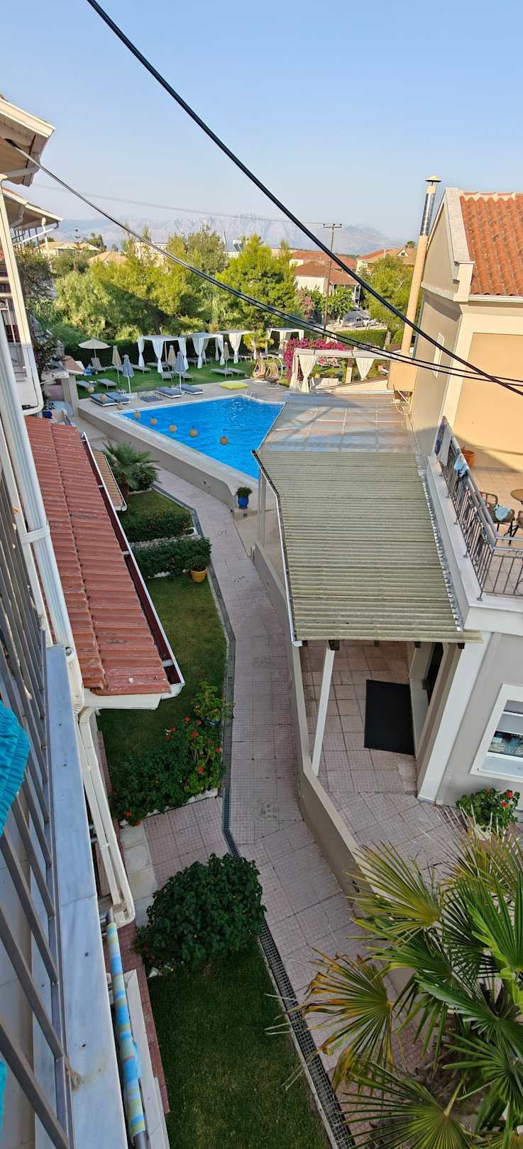 Ausblick aus Haus 1 auf den Pool.
