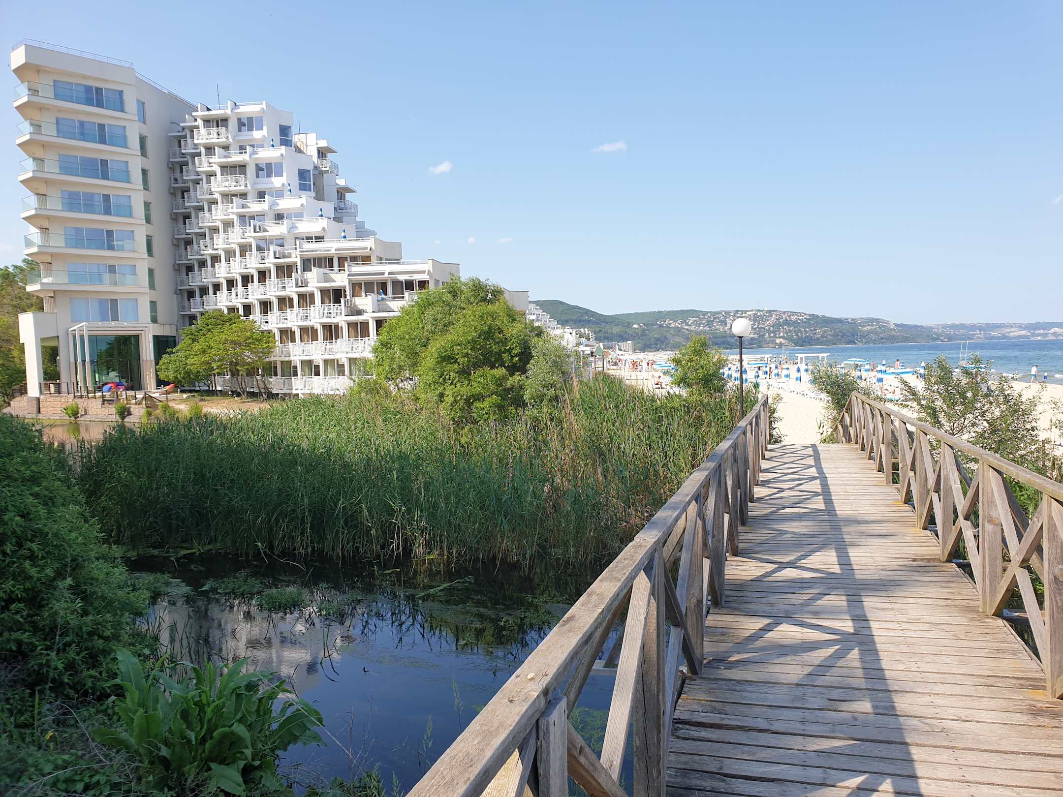AußenansichtDas Hotel vom "Niemandsland" zwischen Albena und dem Nachbarort Kranewo. Dort befindet sich auch der halboffizielle FKK Strand. Die blauen Schirme im ruhigen Bereich sind exklusiv für die Gäste der Suiten ("normale" Liegen näher an Pool/Bar ;-) ).