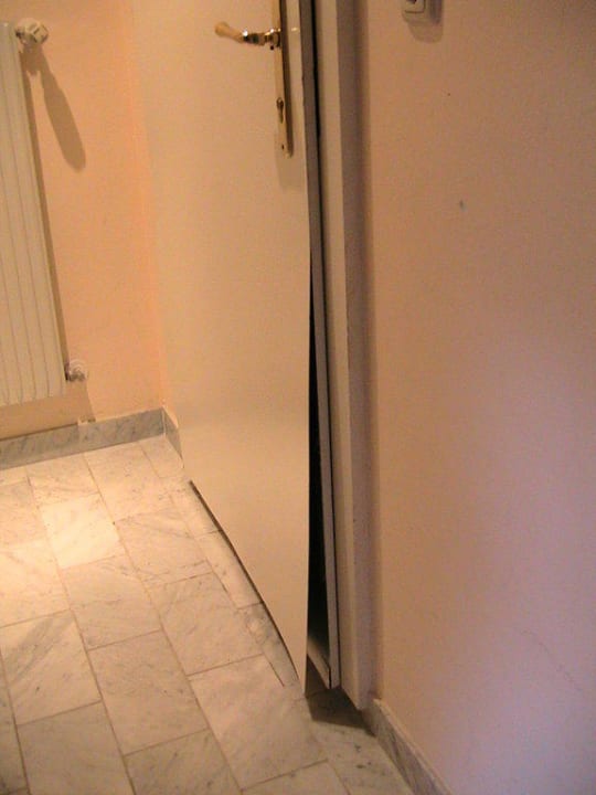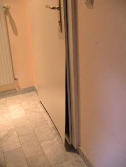 Gelöste weghängende Türbeschichtung an der Eingangstüre.