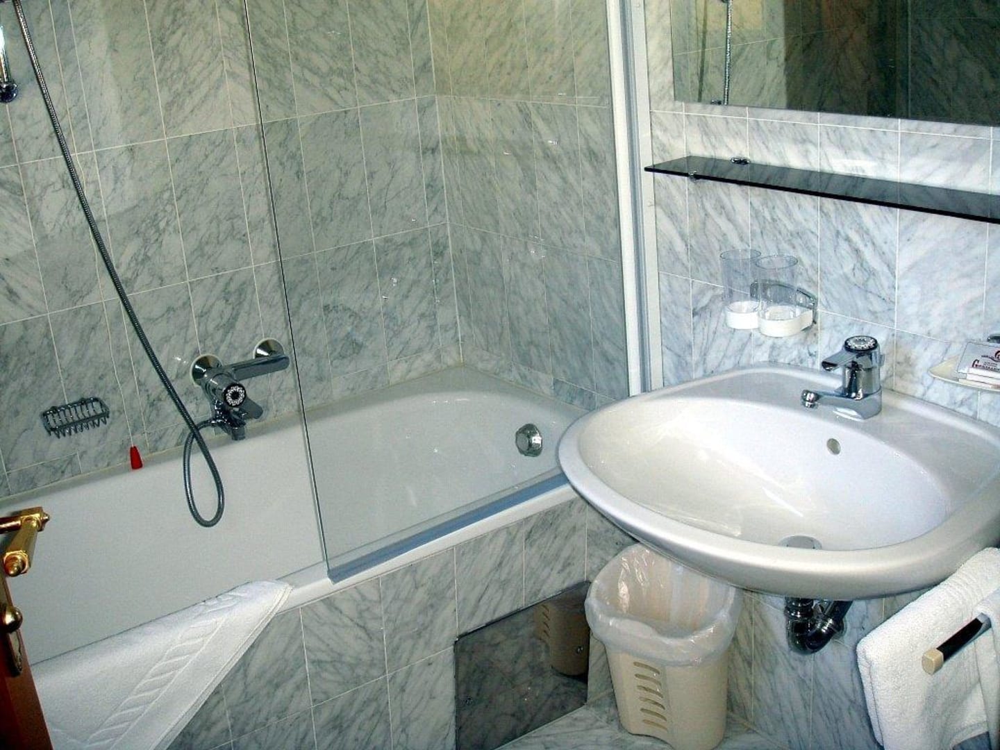Wanne mit schwenkbarer Duschwand, Föhn vorhanden.