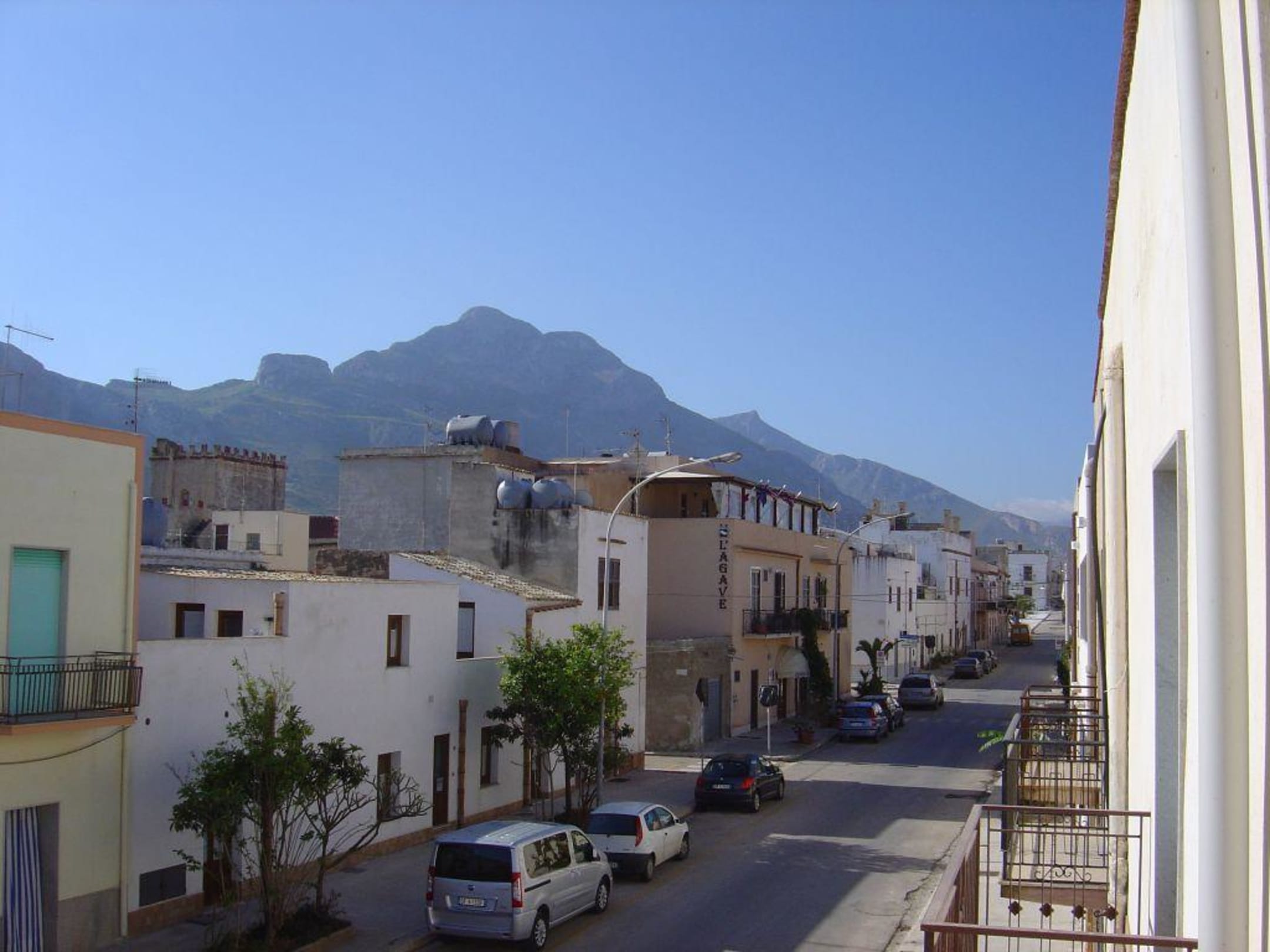 Blick vom Zimmerbalkon auf die Berge und San Vito wirkt beinahe afrikanisch