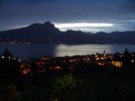 Blick von unserer Urlaubsterrasse über Torri del Benaco hinweg auf den abendlichen Garsasee - dazu einen Bardolino (rosso) ... was will man/frau mehr...
