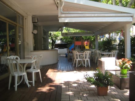 Hier steht das Frühstücksbüffet , Kinderspielplatz und Grill im Hintergrund
