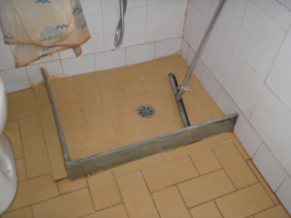 Duschvorrichtung mit dazugehörendem Wasserschieber für vorprogrammierte Überschwemmung weil der Duschvorhang wegen ekelerregendem Zustand sowieso nicht benutzt werden konnte