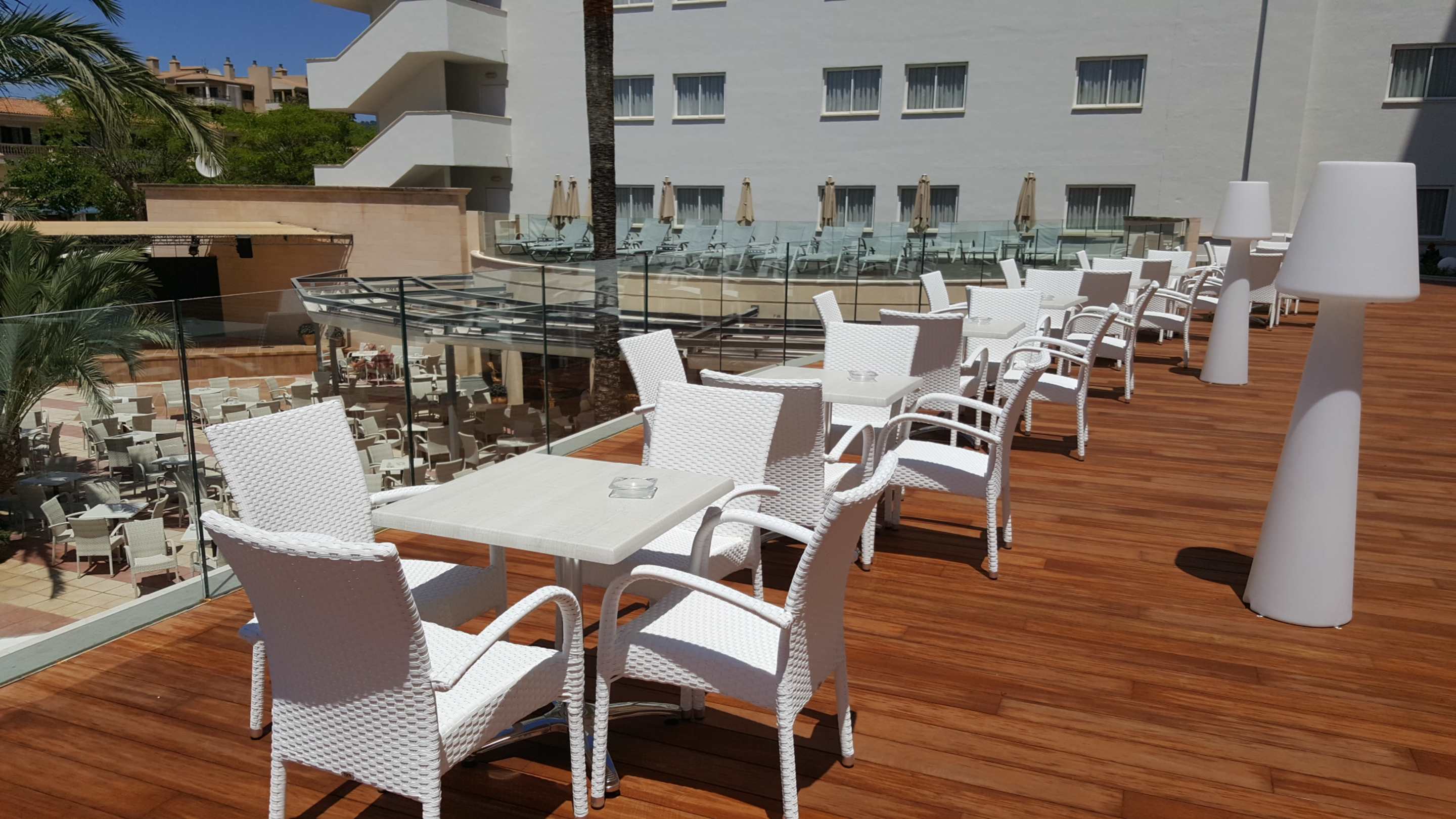 hier die neue Sonnenterrasse - dahinter sind weitere Liegen und Sonnenschirme