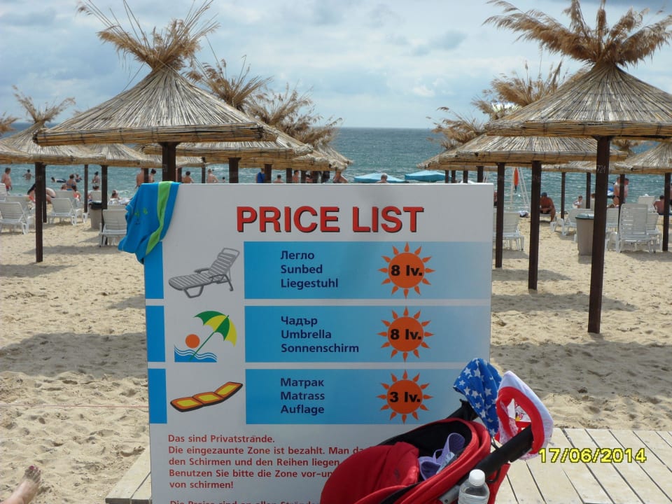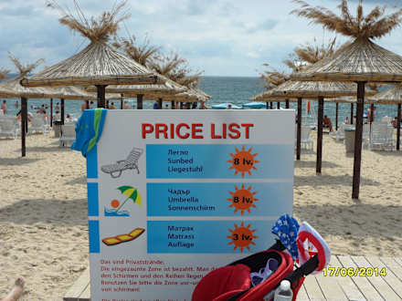 Preisliste am Strand (für 2 Personen 1 Schirm und 2 Liegen mit Auflagen zahlt man 30,- LEV, das sind rund 16,-€ am Tag. Bei den Preisen war noch viel Platz. Belegt waren nur die Liegen der teuren Hotels mit AI