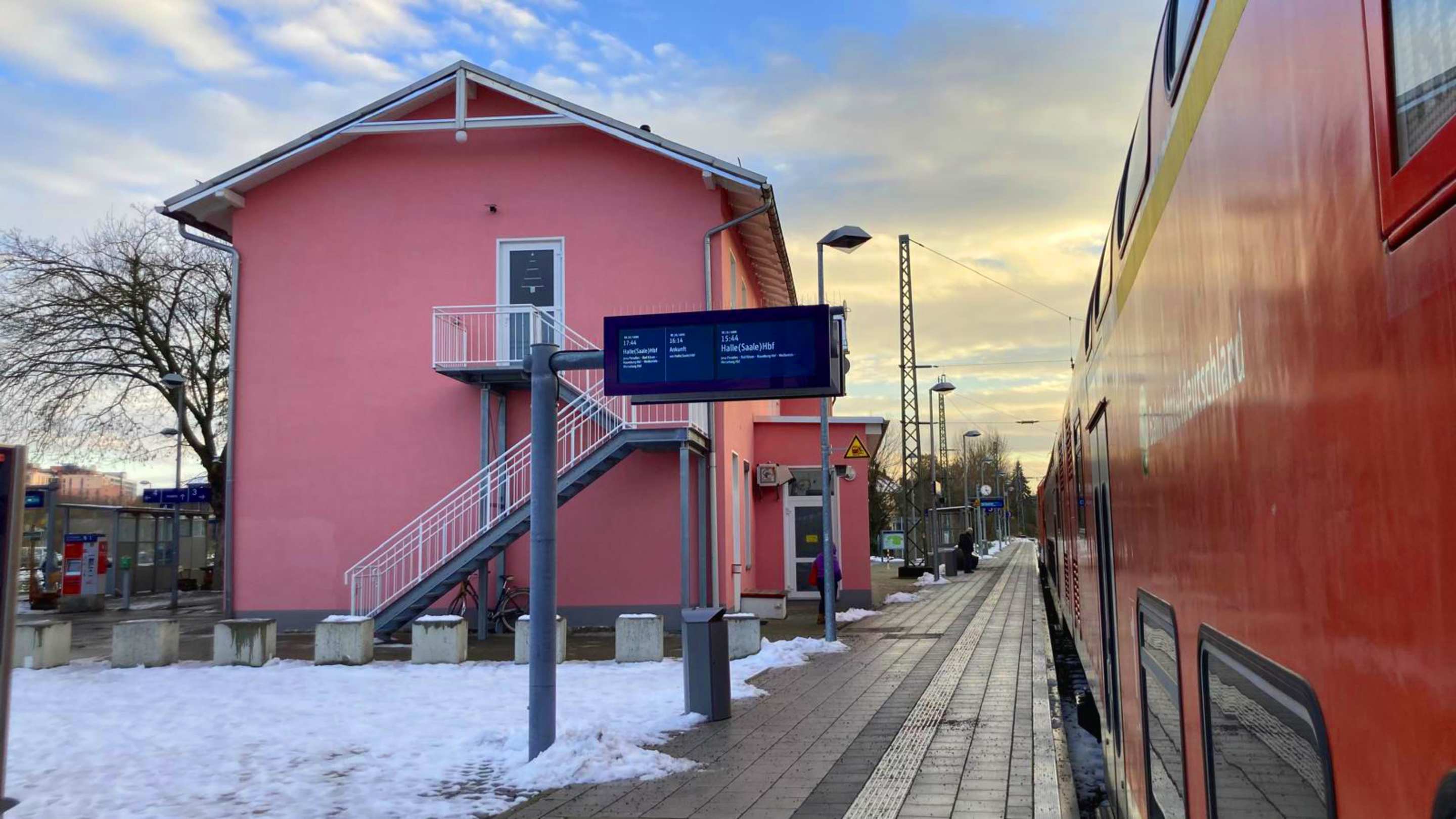 Hier kann man wirklich vom Zug direkt ins Hotel! Die Rezeption befindet sich auf der anderen Seite des Gebäudes, wo sich ein weiterer Bahnsteig, und eine kleine Gastronomie befindet.