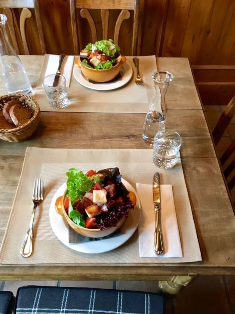 Mittagessen mit Haussalat und warmen Brotcroutons