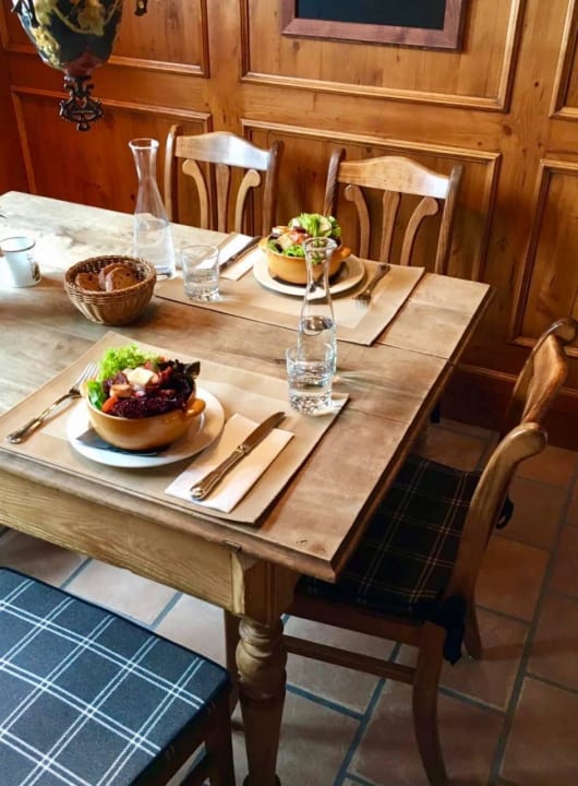 Mittagessen mit Haussalat und warmen Brotcroutons