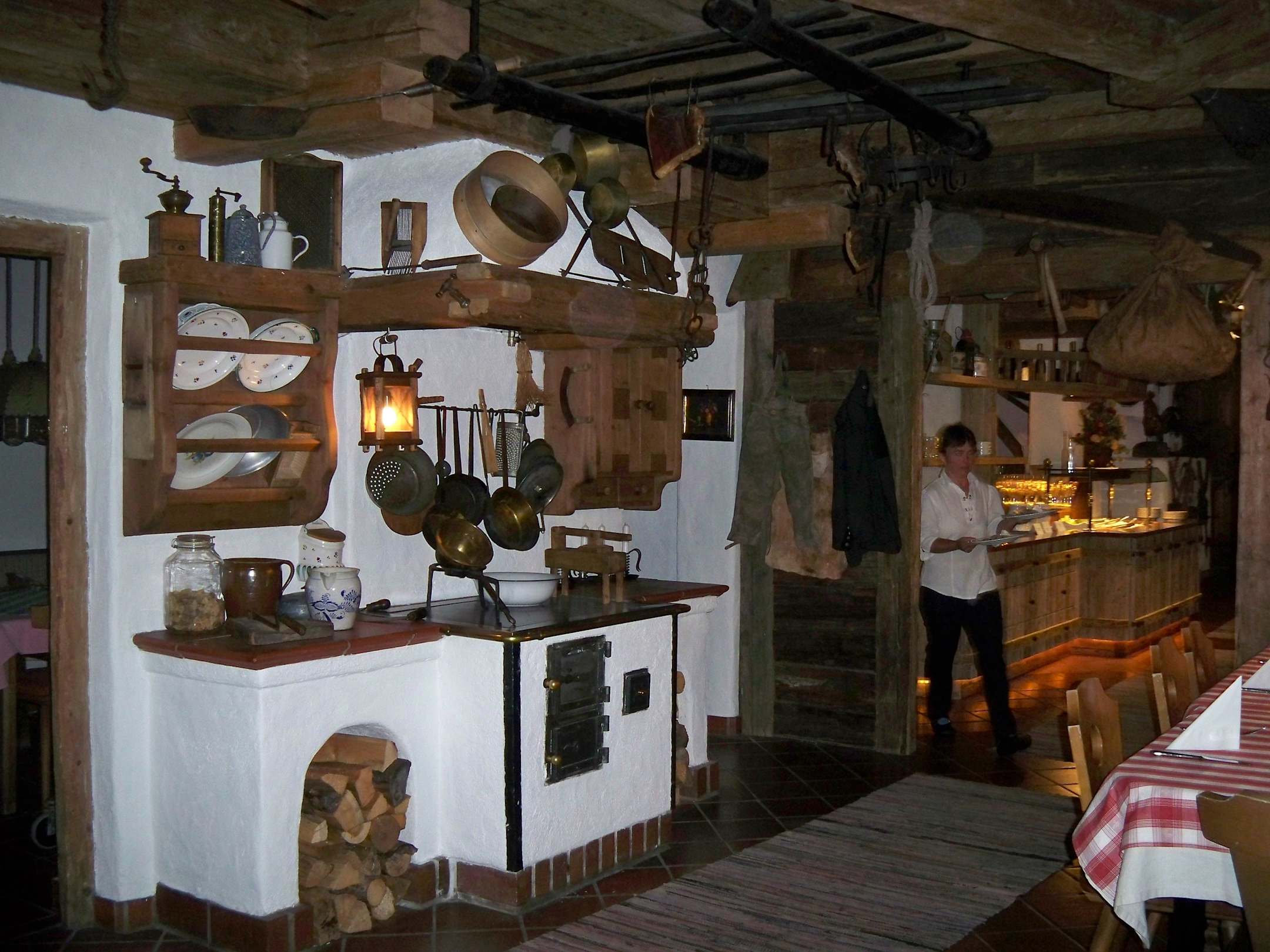 Gaststube mit alter Feuerstelle, im Hintergrund di