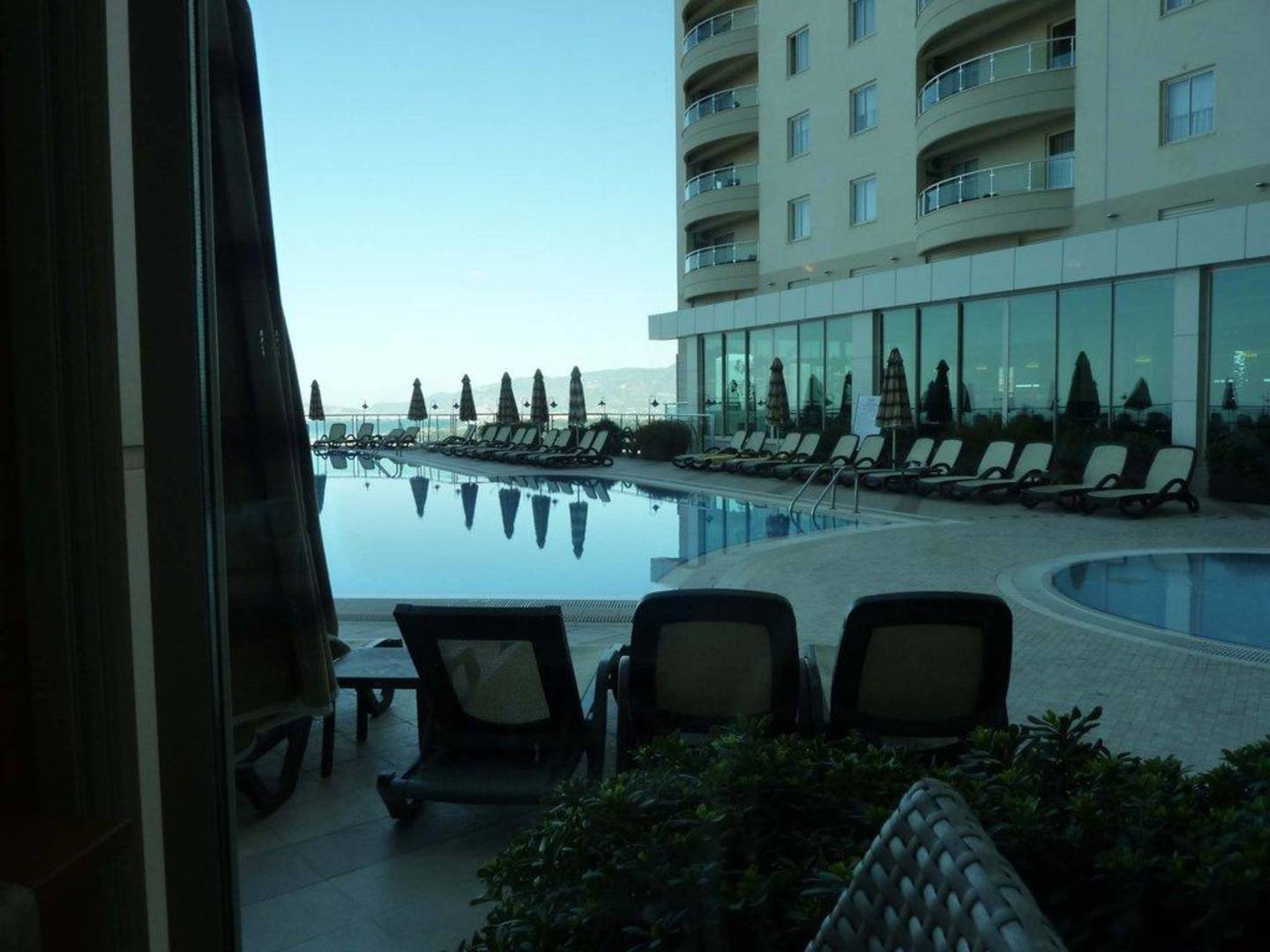 Ausblick vom Speisesaal zum kleineren Pool.