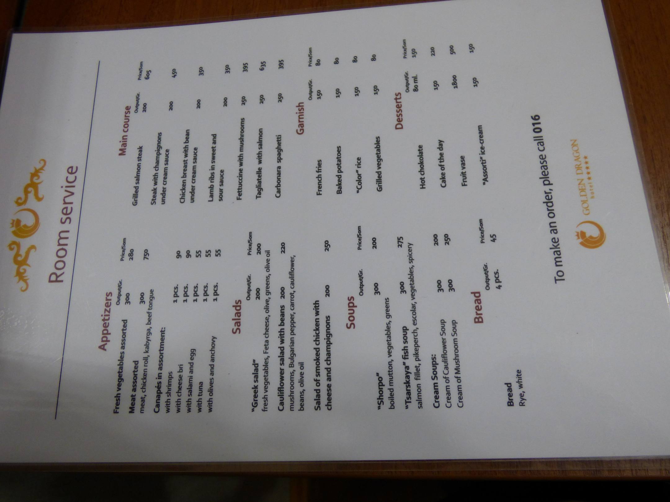 Speisekarte im Zimmer vom Roomservice