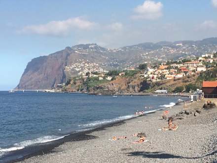 Blick auf die Steilklippe Cabo Girao; Tipp von uns: Geht den Strand bis zum weißen Pavillion: dort kann man für nur 5,60 € 3 Liegen und einen Sonnenschirm pro Tag buchen
