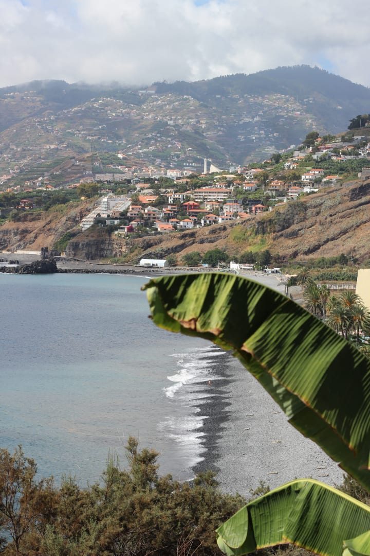 Blick vom Pool-/Gartenbereich auf den Strand Praia Formosa