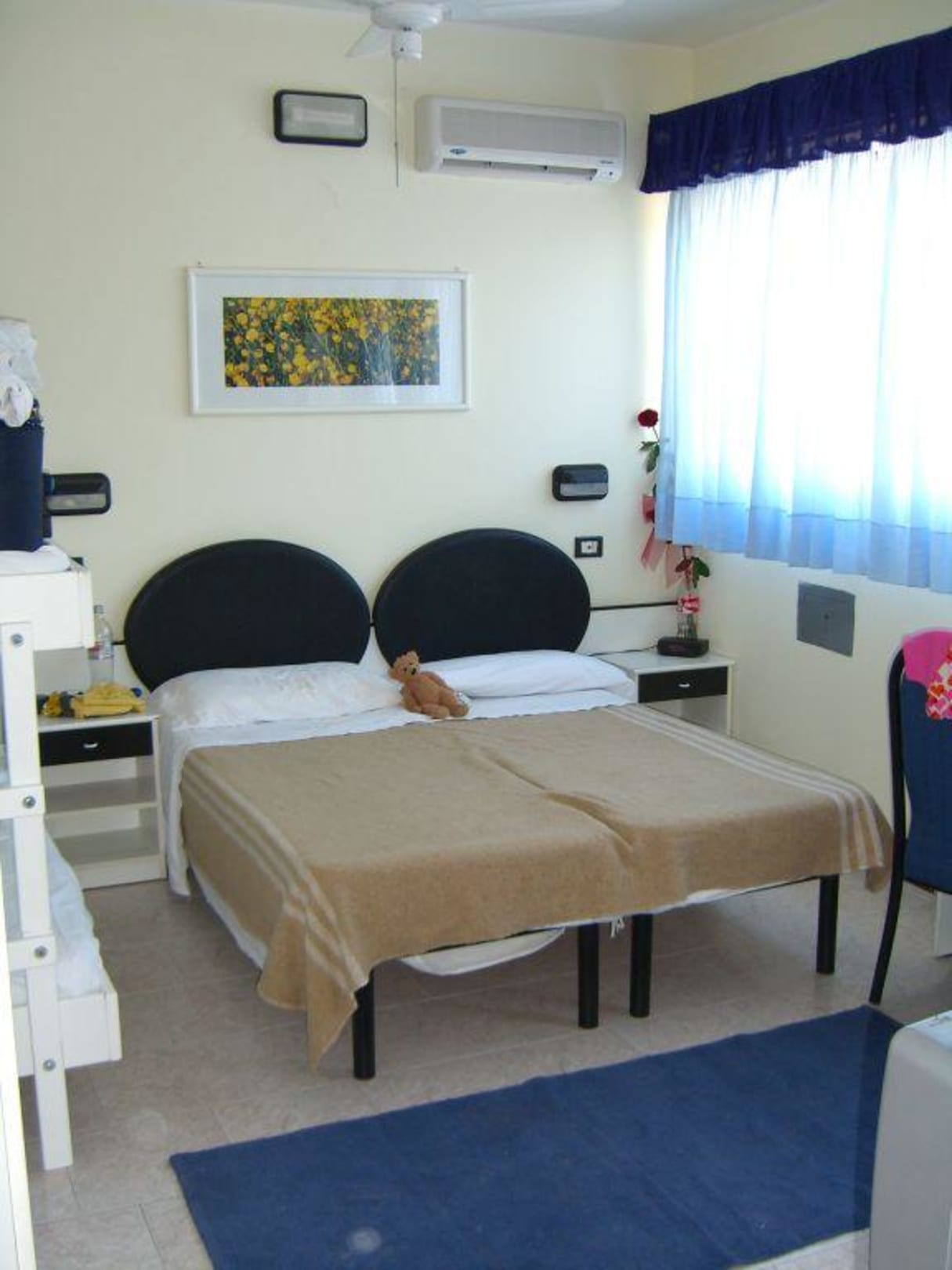 Zu sehen sind die zwei Einzelbetten, welche als Doppelbett zusammen gestellt sind. Links das Doppel-Hochbett. Wandsafe, Klima, sowie Deckenventilator.
