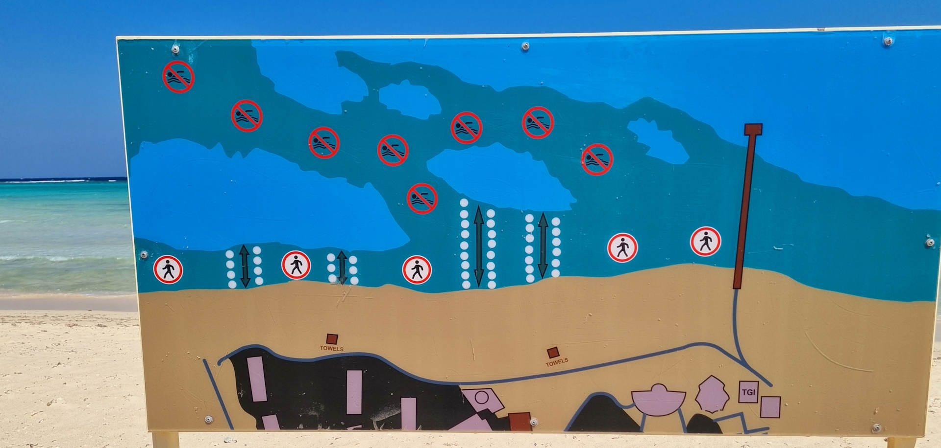 Hinweistafel am Strand - wo sich die Zugänge zum Innenriff befinden. Auf dem Riffdach darf weder gelaufen noch geschwommen werden. Wird leider zu oft ignoriert!!