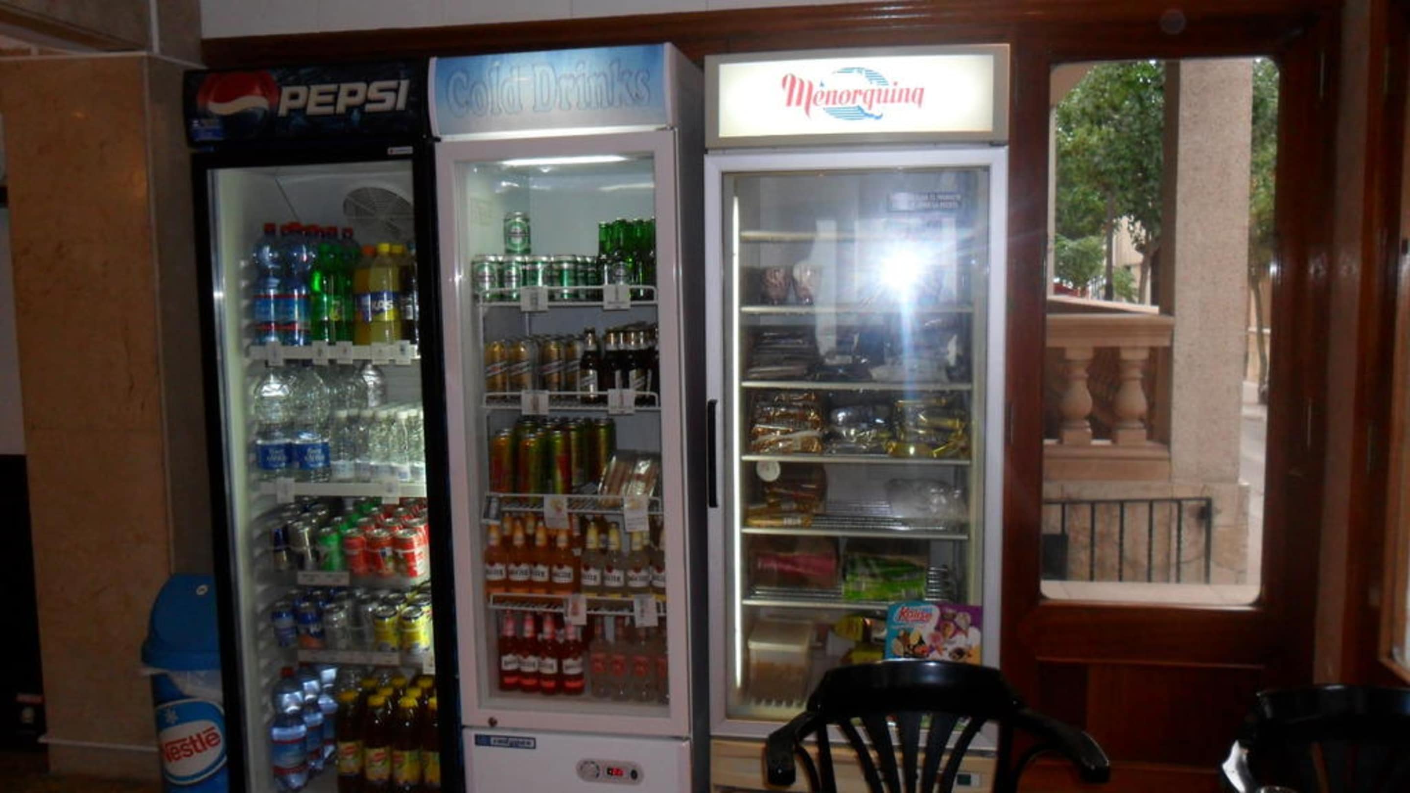 Hier gibts Getränke und Eis und Sandwiches. Zum Abendessen kann man sich die Getränke aus dem Schrank nehmen und an der Rezeption nebenan bezahlen. Dose Cola 1,50€, Flasche Pepsi (1L) 2,00€ Preise völlig okay