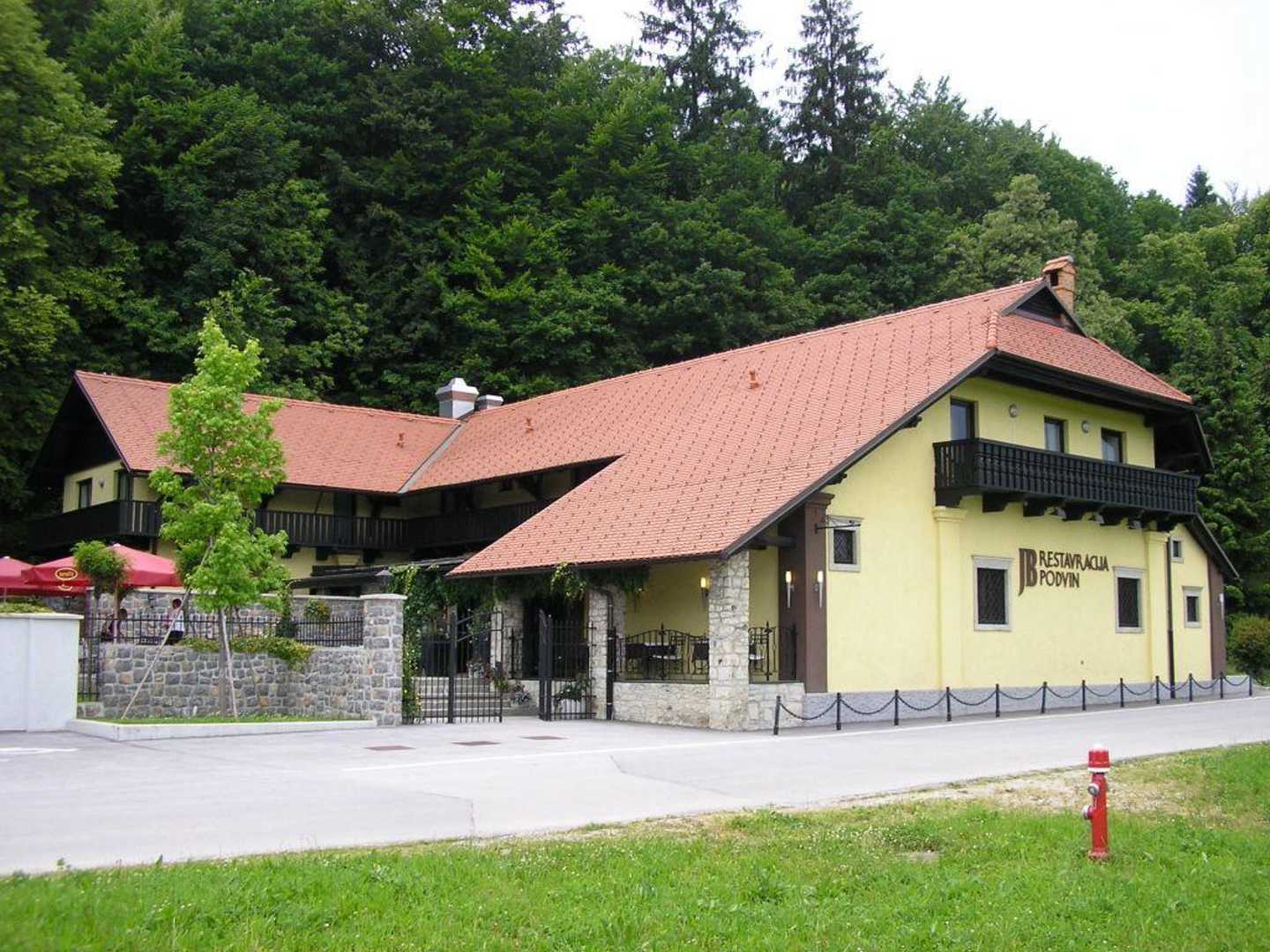 Der Teilbereich Restauracija JB Podvin des Hotels Grad Podvin (Ansicht von der Straße). Außer dem Restaurant mit gehobener, ausgezeichneter Küche befinden sich im Haus moderne renovierte Zimmer.