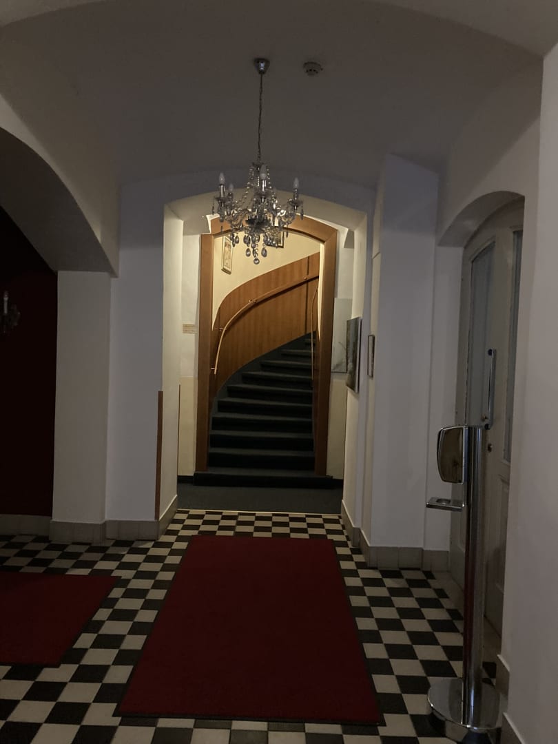 Eingang mit dem Aufgang zu den Zimmern
