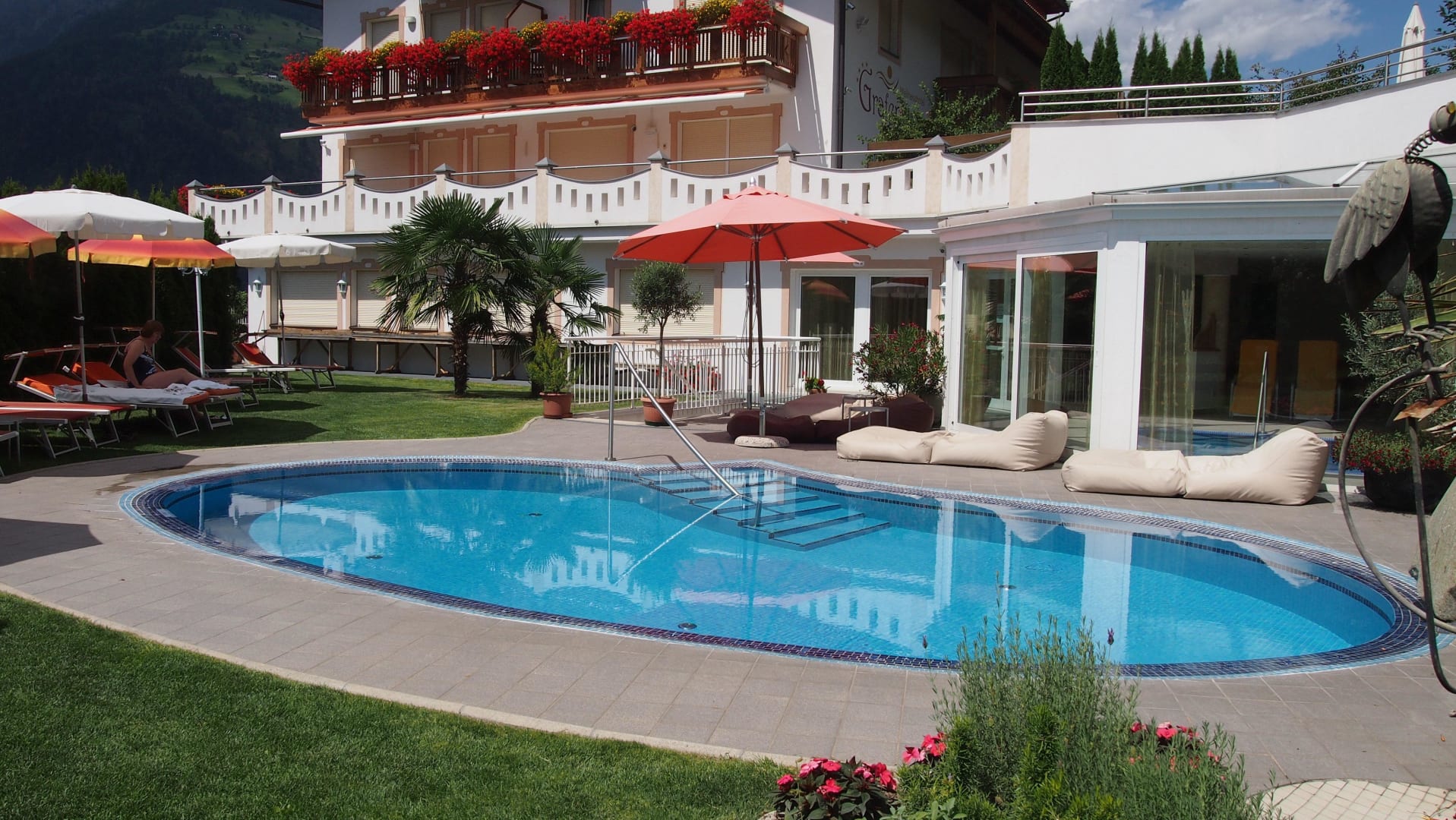 Buitenbad met uitzicht op hotel en ligweide