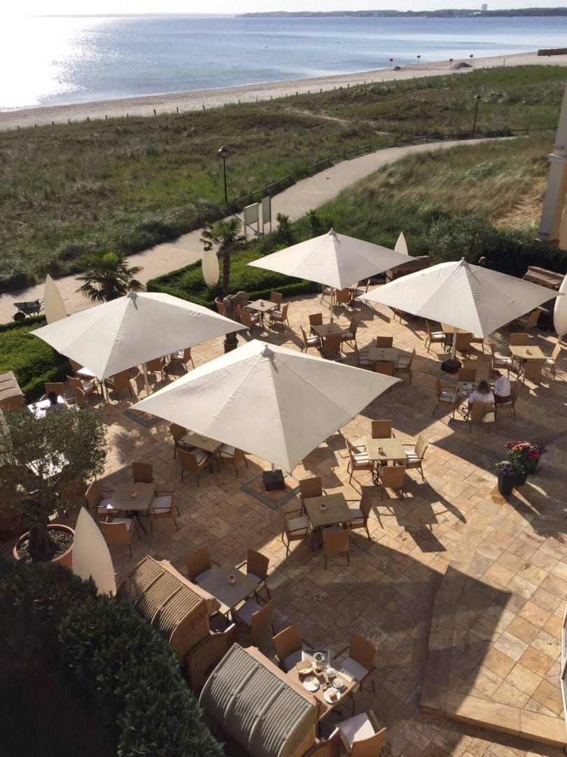Blick auf Aussenterrasse und Meer