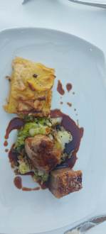 Verbrannter, vertrockneter Kartoffelauflauf mit lauwarmem Fleisch.