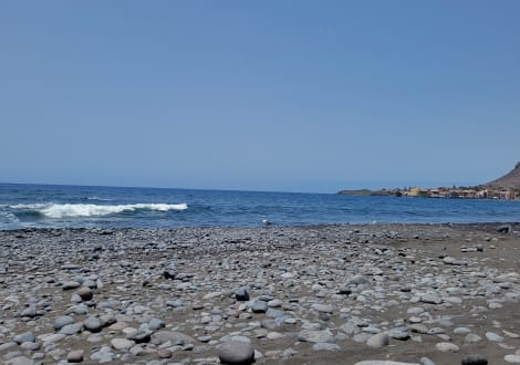 Oben etwas steinig, weiter unten schwarzer Sand