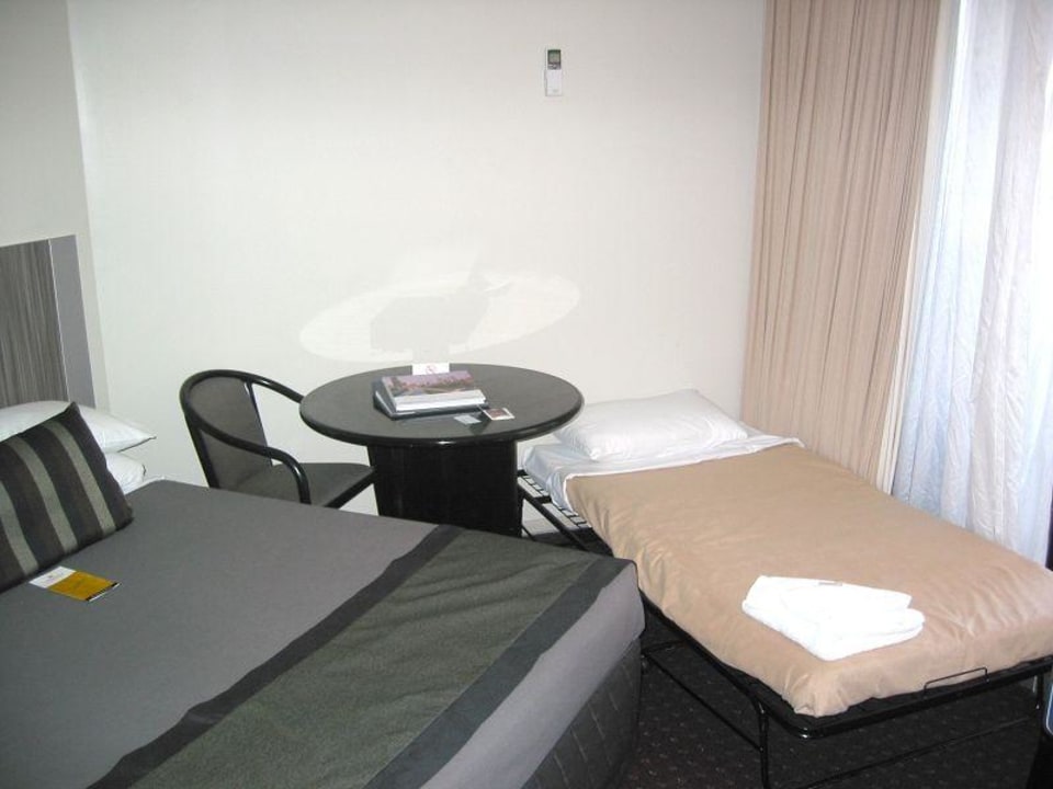 Hotel Grand Chancellor BrisbaneZimmer mit dem Zustellbett. Zwischen Zustellbett und dem anderen Bett ist kein Platz mehr.